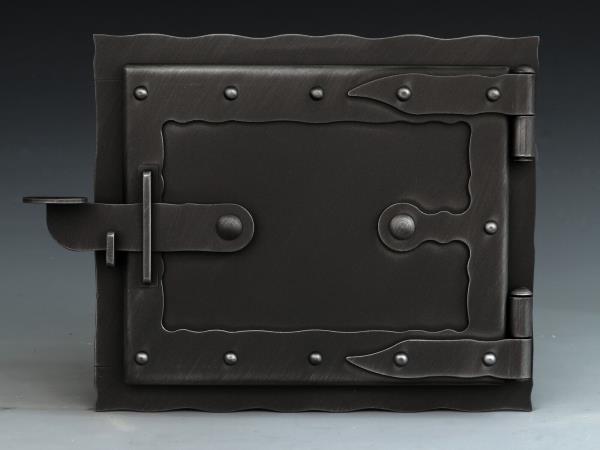 Masivní přikládací dvířka z 3mm silného nerezového plechu,povrchvá úprava žáruvzdornou barvou a následný výpal v peci.
