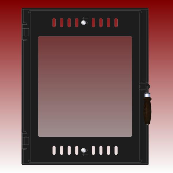 Dvířka ocelová mají jednoduchou konstrukci s použitím silného plechu 4mm a odlévaných masivních prvků (pantů a uzávěru).Regulace vzduchu je lamelou na dvířkách,prim a sec.Povrchová úprava-- tryskání,nástřik žáruvzdornou barvou a následný výpal v peci na 300C.Součástí jsou 4 úchytky pro montáž.